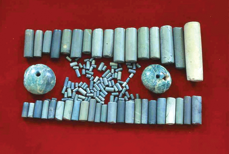 玉有天河石制曲玉和碧玉制管玉、环玉、小玉等.曲玉是用蓝底有白斑的天河石制而制,在一头有一个小小的窟窿.在全南丽水平吕洞的墓室发现了一对环玉、还有数个或数十个小玉.这些可能是项链和装饰服装的首饰,在对马韩的记录中有‘马韩人比金、银更珍惜玉,曾把玉戴在耳朵,挂在项上或装饰在服装上’.由此可知在支石墓社会已用玉进行装饰.