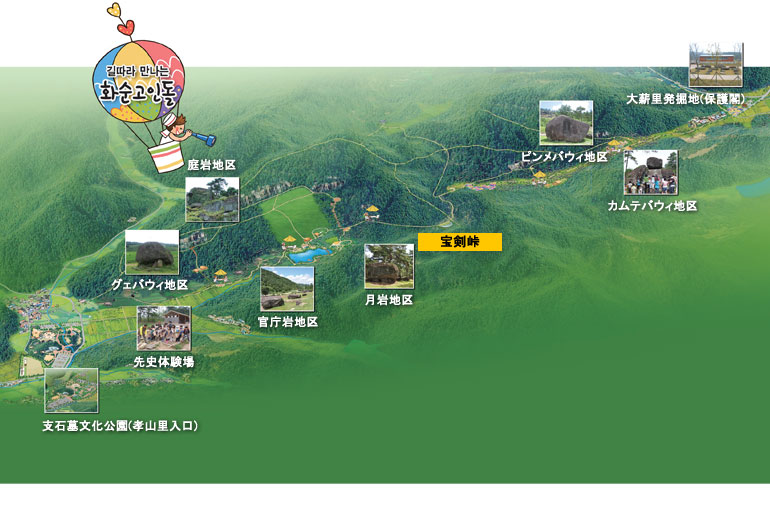 支石墓文化公園(孝山里入口)→グェバウィ地区→官庁岩地区→月岩地区→宝剣峠→ピンメバウィ地区→カムテバウィ地区→大薪里発掘地(保護閣)