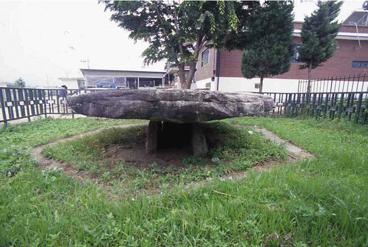 卓子式支石墓は板石で構築した埋葬主体部が地上に露出している型式で、4枚あるいは6枚以内の板石を組み合わせた石室の上に平らな上石が載せられたものである.主に漢江以北から中国遼寧地方に集中分布していることから北方式とも呼ばれる.北朝鮮では五徳型と呼び、中国では家の形を呈していることから石棚と呼ぶ.卓子式の中で大型のものは主に祭壇や記念物として築造されたものである.これまで発見された卓子式支石墓の分布の南限は、慶尚南道の居昌と全羅南道の霊岩、康津である.