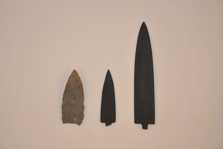 磨製石鏃は狩猟道具や武器として使われ、その大部分が青銅器時代に製作・使用された. 石槍は狩猟道具の中で最も強い殺傷力を持つ道具で、旧石器時代以来、効果的に利用されてきた狩猟道具である同時に、攻撃と防御機能を有する武器の一種でもある.
