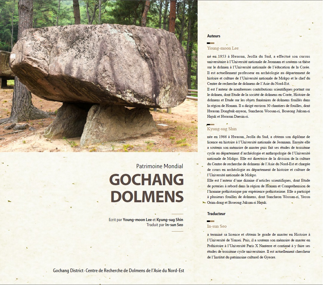 이 책은 고창군과 함께2009년에 발간한 교양서적‘세계유산 고창고인돌’을 프랑스어로 번역하여 발간한 것이다.세계유산으로 지정된 고창고인돌의 우수성을 알리고 한국인뿐만 아니라 외국인에게도 널리 알리기 위해 제작된 것으로 세계문화유산과 고인돌이 무엇이며 한국의 고인돌이 세계유산으로 주목받는지에 대한 전반적인 내용이 담겨져 있다